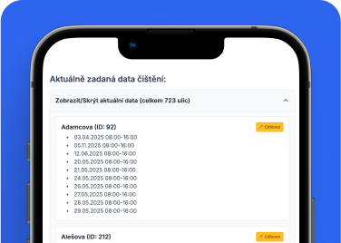Aplikace je navržena tak, aby byla správa termínů blokového čištění pro města co nejjednodušší.